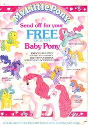 Hasbro's final US brand collaboration began in 1991 with Kellogg's Rice Krispies. Consumers could choose between a G.I. Joe action figure, My Little Pony baby pony, or a Weebles figure with two proofs-of-purchase, or they could receive two toys with three proofs-of-purchase. The inside of the cereal box also had coupons printed on it, including one for the Secret Surprise Ponies.