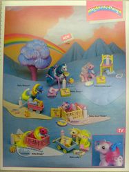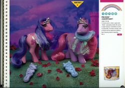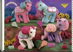 Stationery company Current Inc. offered two baby ponies in its catalog in the late 1980s. They are known in the community as the "Valentine Twins," but it is unknown whether they have official names. Per their packages, the white pony is simply labeled "My Little Pony Toy," and the purple pony is labeled "1st Tooth My Little Pony Toy." Their packages list a 1988 copyright date, but they were likely available to order in 1989 or later.