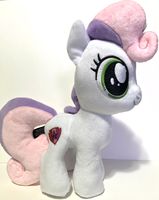These plush came with holiday themed mugs and are about 7" tall. They only have their cutie mark on the left side, have yarn hair, and have "My Little Pony" stamped on the bottom of their front left hooves.