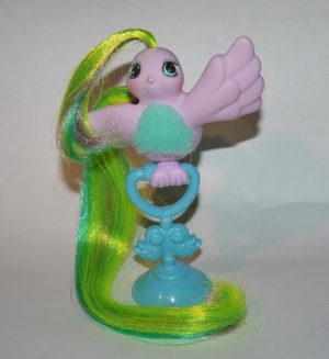 The Fan Tails are to the Fairy Tails line what the Flutter Ponies are to the My Little Pony line. The Fan Tail gimmick is a gorgeous, glittering fan attached to the bird's tail, invoking a peacock-esque appearance. However, those fans are also very likely to either break off or have the metallic cloth damaged by uncareful handling of the fan. The Fan Tails were released in three poses with two color palettes per pose, and came with a bird-shaped comb, a perch and a satin ribbon.