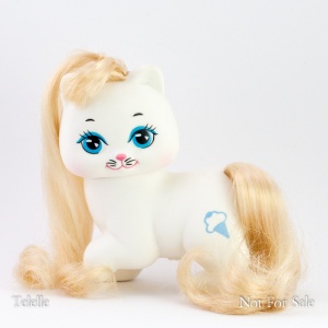 Little Pretty is a set of kitty and puppies toys made in a very similar style to My Little Pony. I.e. lots of pastel colors, symbol/cutie marks, brushable manes/tails. They were Made by Mattel from 1989-1991. [1]