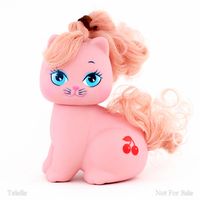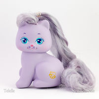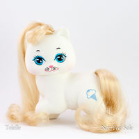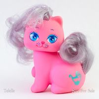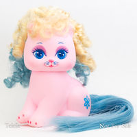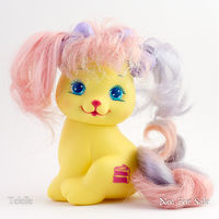 Little Pretty is a set of kitty and puppy toys made in a very similar style to My Little Pony. I.e. lots of pastel colors, symbol/cutie marks, brushable manes/tails. Very similar to Curly Kittens aka Palace Pets except that Curly Kittens do not have symbols. They were Made by Mattel from 1989-1991. [1]