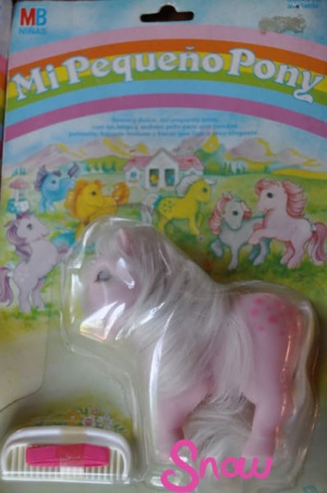The Spanish Snuzzle is a piggy pony made by Brekar. Its Spanish name is Perla according to the Brekar backcard for the piggy ponies.