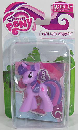 | − | '''Twilight Sparkle''' is a [[:Category: Generation 4|G4]] [[:Category:G4 Unicorn Ponies|Unicorn Pony]] and one of the main characters in ''[[My Little Pony: Friendship is Magic]]''. As one of the main characters, Twilight Sparkle has been released in toy form multiple times. After the Season 3 finale, "[[Magical Mystery Cure]]", Twilight Sparkle was redesigned as an an [[:Category:G4 Pegasus Unicorn Ponies|Alicorn]]. In merchandise released after this change, she is uniformly referred to as Princess Twilight Sparkle, and | + | '''Twilight Sparkle''' is a [[:Category: Generation 4|G4]] [[:Category:G4 Unicorn Ponies|Unicorn Pony]] and one of the main characters in ''[[My Little Pony: Friendship is Magic]]''. As one of the main characters, Twilight Sparkle has been released in toy form multiple times. |