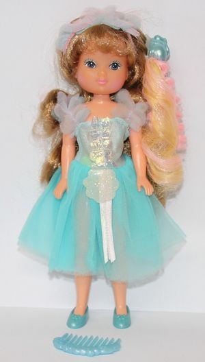 Original Maiden FairHair came with a colourful, mainly blue dress with blue shoes, three chipmunk pixietails and a blue comb.