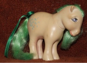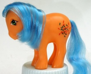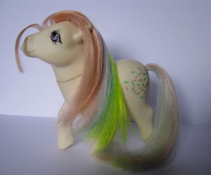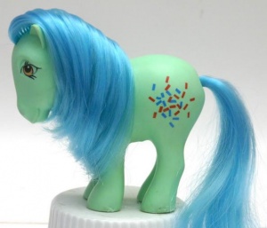 Confetti is a G1 Rainbow Pony. The US Store Version Confetti has lighter symbols than the mail order version that was released a few years later.