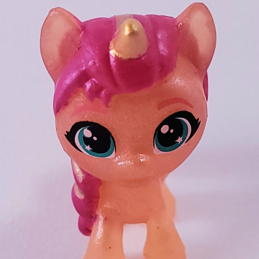 Closeup of Mini World Magic alicorn Sunny's unique star eyeshines