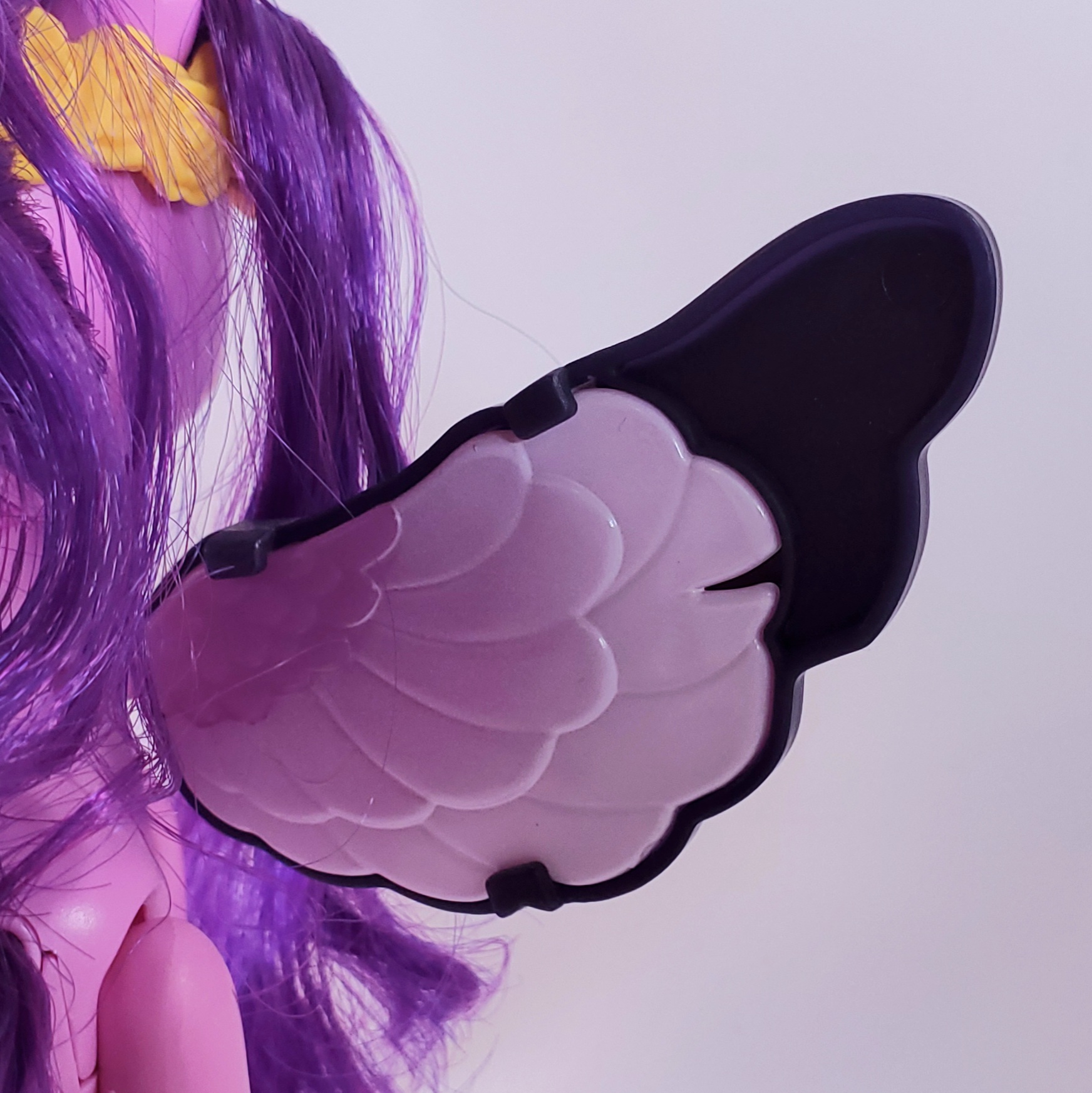 A photo showing how Style of the Day Pipp's butterfly wing accessories attach to her pegasus wings