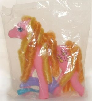 Hasbro again partnered with a US food company in 1986, this time Franco American's SpaghettiOs, to provide pony lovers with a set of four plastic tumblers and a poster when consumers purchased four cans of SpaghettiOs.