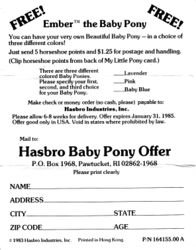 Ember is the first mail order pony. Before she was named Ember, the order form called her "My Beautiful Baby Pony." She was available to order in three different colors.