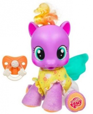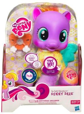 So Soft Newborn SUNNY DAZE loves to laugh and play all day! When she says, "I’m tired," she is ready to take a nap. Give her the pacifier to help her fall asleep! Soft and sweet, your SUNNY DAZE pony figure loves to go on adventures with you all day, and cuddle with you anytime! At bedtime, she needs extra love and care, and you can rock her to sleep and give her a pacifier. Press her foot and she’ll say "I’m tired," to let you know when it’s time for a bit of sleep, or maybe she’ll sing a pretty little song to make you smile. If it’s bedtime for you, too, snuggle with her and you’re both sure to have very sweet dreams! Pony figure comes with pacifier. Includes 2 "AAA" batteries. Ages 3 and up.