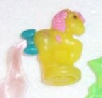 Pale yellow with blue mane and turquoise tail, pink bow, pink moon with nightcap (need photo)