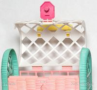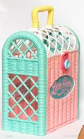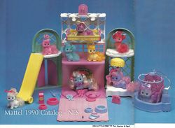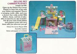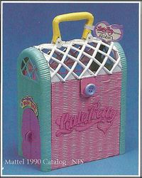 Beauty City aka Pet Carrier & Spa appeared in the 1990 Mattel Catalog (pages 94, 95).[2] The catalog photos show a yellow slide and a set of purple doors on the side of the folded up carrier but these features do not appear to have been included in the retail version. The Mail Order Pamphlet calls this set Deluxe Pet Carrier Playset.[3] The Mattel Girls Toys 1990 Repro Art Book calls this set Beauty City Playset/Carrier[4].