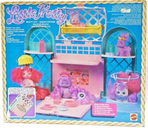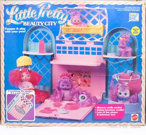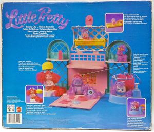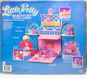 Beauty City is a large playset that came without any figures.[1] This playset appears in multiple catalogs & advertisements with slightly different names: Pet Carrier & Spa, Deluxe Pet Carrier Playset, Beauty City Playset/Carrier, and simply as Beauty City on the international packaging.