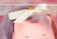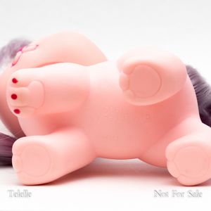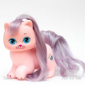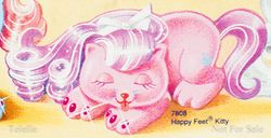 Happy Feet is a pink adult kitty with purple hair. Her beauty mark, or symbol, was the only one in the Polished Paws set to become a teal color when activated. She is part of the Polished Paws set where her beauty mark and nail polish would appear or disappear with the application of cold or hot temperatures, usually with an ice cube or hot water. Hot temperatures make the marks disappear and cold temperatures make them appear. Her pose made it difficult for her to stand without tipping over.