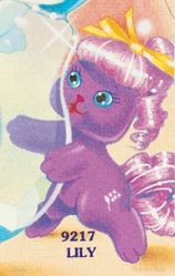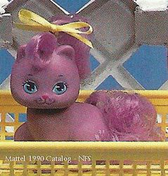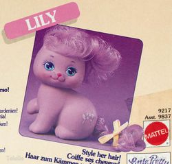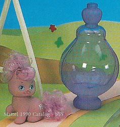 Lila as well as the Gift Set appeared in the 1990 Mattel Catalog (pages 87, 90, 91, 94). The release of Lila and the Gift Set both differ from the catalog version - the figure is the same but Lila is show in a pink perfume bottle on one page and near a blue bottle on another. The Gift Set shows the "real" perfume bottle with a very different shape and color from that of the release version. [2] The Gift Set is also shown in the Mattel Girls Toys 1990 Repro Art Book[3]. Lila also makes an appearance in the Mail Order Pamphlet[4].