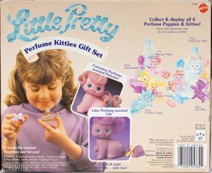 This gift set came with Lila and Pinkums in their perfume bottles and a real 1 Oz. perfume bottle containing real lily-scented perfume. In catalogs this set is called "Cologne Gift Set" but actual packaging uses the name "Perfume Kitties Gift Set". The shape and color of the real perfume bottle is different than what was shown in the catalogs which was golden and read "Dazzling Dream Cologne" on the bottle - the actual released version of the bottle was red with a purple bow lid and read "Little Pretty Fragrance".