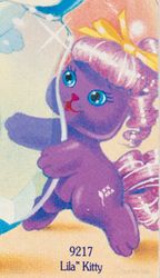 Lila is a scented purple kitten with purple hair that came in an aqua perfume bottle. She is part of the Perfume Pets set and her symbol directly relates to her scent - lilac. Lila was available by herself or in a gift set with Pinkums.
