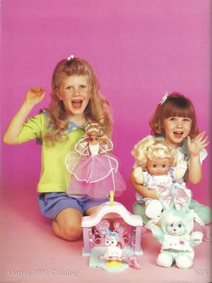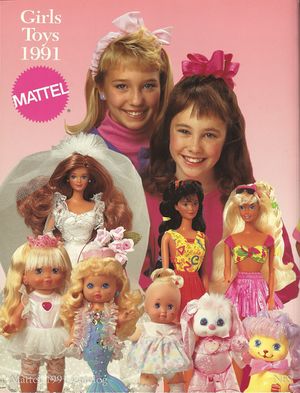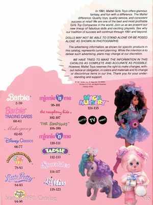 The Mattel 1991 Girls Toys Catalog had many Little Pretty appearances within its pages as well on the back cover, inside cover, and back cover pages. There are no images of Little Pretty figures on the cover of this catalog.[1]