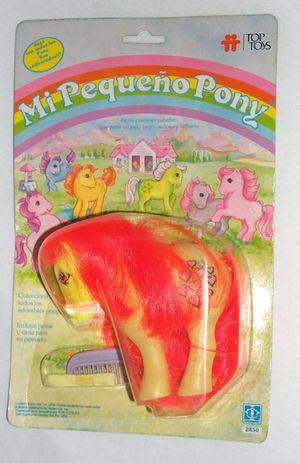 The Spanish Piggy Peachy was produced by Milton Bradley as part of the Establo de Belleza (Grooming Parlor) set. The parlor contained the name tags for all the other Milton Bradley piggy ponies. Peachy is not displayed on the backcard for the Milton Bradley piggy ponies. See Spanish Piggy Ponies for information.