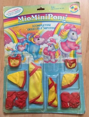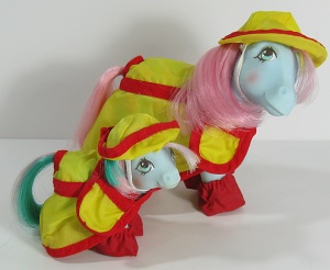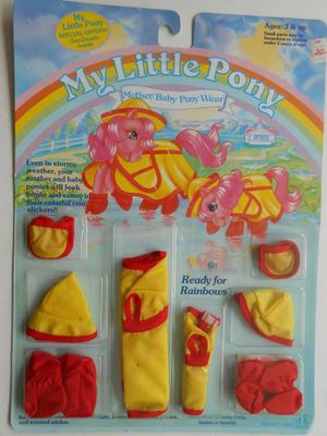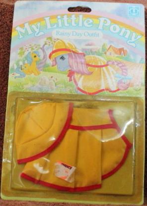 Rainy Day Outfit is very similar to the Ready for Rainbows outfit, however it contained wear for only one adult pony and was not sold in the U.S. In addition, the Rainy Day Outfit is more akin to actual raincoat rubbery material than the slick "rain slicker" fabric of the Ready for Rainbows set.