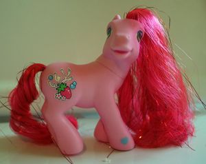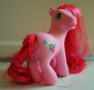 Strawberry Reef was released in 2005 as part of the Shimmer Ponies assortment. She was also released as a bonus pony in the Wonder Waves Surf Shop.