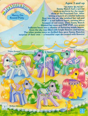 Sunny Bunch had a special trick to perform for the magic show at the Ponyland Fair. After letting a bunch of colorful balloons float in the air, she swished her tail and POP - a red balloon burst, turning into a bouquet of red roses. Then Sunny Bunch blinked her eyes and POP-POP, two green balloons burst into a shower of fluttering maple leaves. Soon the sky was filled with bright flowers and leaves! The other ponies were so thrilled they gave Sunny Bunch a surprise of their own - a beautiful cape decorated with flowers!