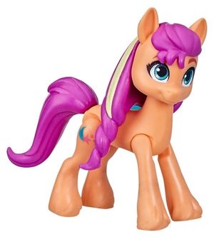Meet the Mane 5 Sunny Starscout is a 3-inch tall poseable earth pony with a molded mane and tail released as part of an Amazon-exclusive set. Included in the set were Hitch Trailblazer, Pipp Petals, Izzy Moonbow and Zipp Storm.