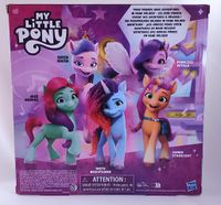 Celebration Tails Sunny Starscout is a 3-inch poseable figure with a molded mane and an extra long brushable tail. Included in the set are Izzy Moonbow, Misty Brightdawn, Pipp Petals and Zipp Storm. The set has notorious quality issues and the tails are prone to falling out.