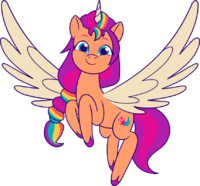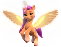 Sunny Starscout is the primary protagonist of Generation 5 and was introduced in My Little Pony: A New Generation movie. She is an idealistic resident of Maretime Bay and the daughter of Argyle Starshine and an unnamed mother. After the pony tribes grew apart, Sunny still believed that they could be friends again as they once had many moons ago. With the help of her childhood friend Hitch Trailblazer, her new unicorn friend Izzy Moonbow and her new pegasus friends Zipp Storm and Pipp Petals, Sunny was able to reunite the tribes and restore the Unity Crystals, bringing lost magic back to Equestria. As reward for this, she was granted the ability to sprout magic wings and a horn, making her an alicorn.